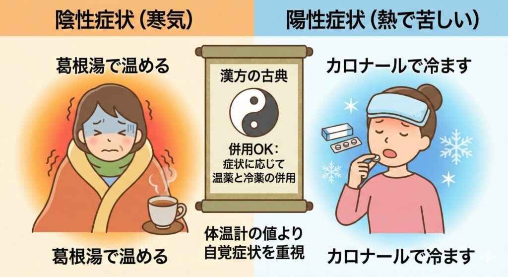 寒気がする時(陰性症状)は葛根湯で温めましょう。熱で苦しい場合(陽性症状)はカロナールで冷ましましょう。併用に問題はありません。漢方の古典でも症状に応じて温める薬と冷やす薬の併用を指示しています。体温計の値ではなく自覚症状を重視するのがポイントです。