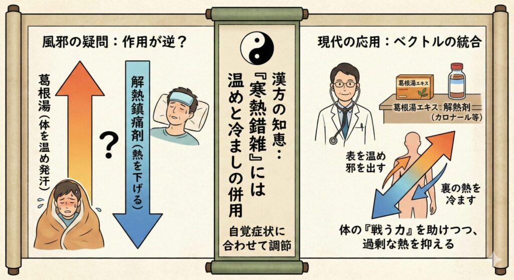 葛根湯は体を温めて発汗を促し、病邪を汗から排出させる処方です。確かに体温を下げる解熱鎮痛剤とは作用が相反する様に見えます。ベクトルの異なる2剤の併用を漢方の理論ではどのように考えるのでしょうか。
