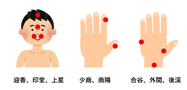 鼻翼の横の迎香、眉間の印堂、髪の生え際の上星は鼻の通りを良くします。鼻筋からおでこにかけて軽くこするようにマッサージします。