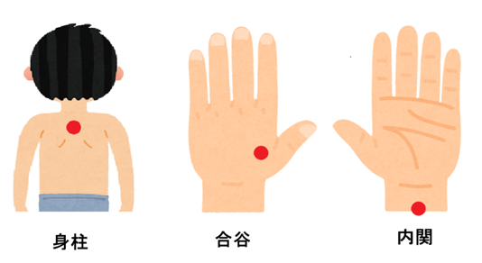 今回のコラムではツボを意識した風邪の手当ての方法を紹介してみます。症状別に色々紹介をしてみますが、特に有名な身柱(解熱、鎮咳)、合谷(鎮痛)、内関(制吐)だけでも覚えてもらうと良いと思います。